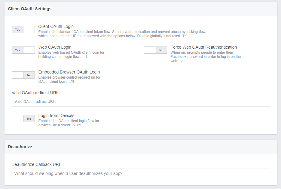 Fill the Valid OAuth redirect URIs with the Redirect URI provided by grantid External Provider's page, available in the Facebook panel, and select Save Changes.