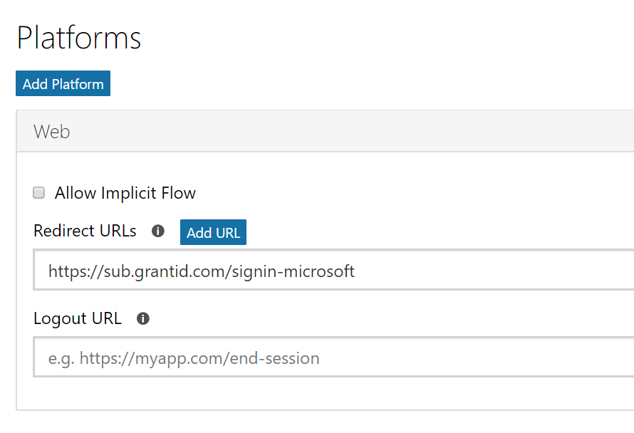 A new panel named Web will be created under the Platforms section. The Redirect URL is available in the Microsoft panel of the grantid External Provider's page.